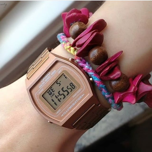 B640WC-5ADF Thiết kế mỏng , nhẹ, dây đeo làm bằng thép không gỉ cao cấp, thân đồng hồ có 3 phím bấm thuận tiện cho bạn sử dụng để chỉnh thời gian, toàn bộ bề mặt được mạ ion màu vàng đồng chống phai cực kì bền với thời gian.