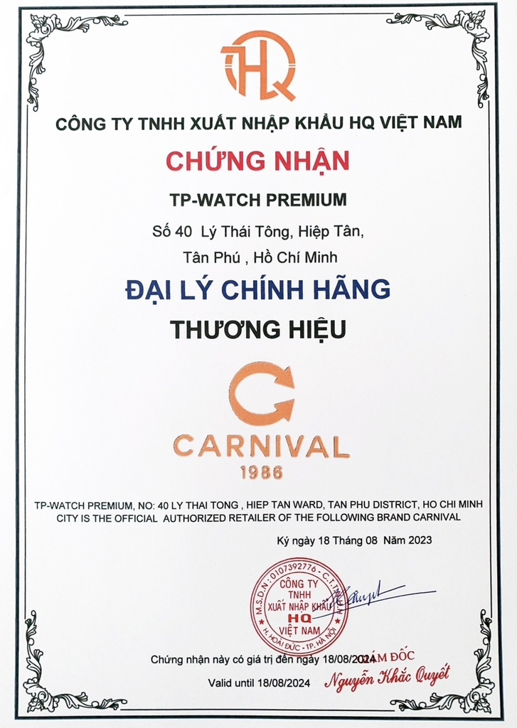 TP-Watch tự hào là đại lý phân phối chính hãng thương hiệu Carnival tại Việt Nam. Tất cả sản phẩm chúng tôi bán ra đều được bảo hành nghiêm chỉnh để quý khách hàng yên tâm sử dụng.