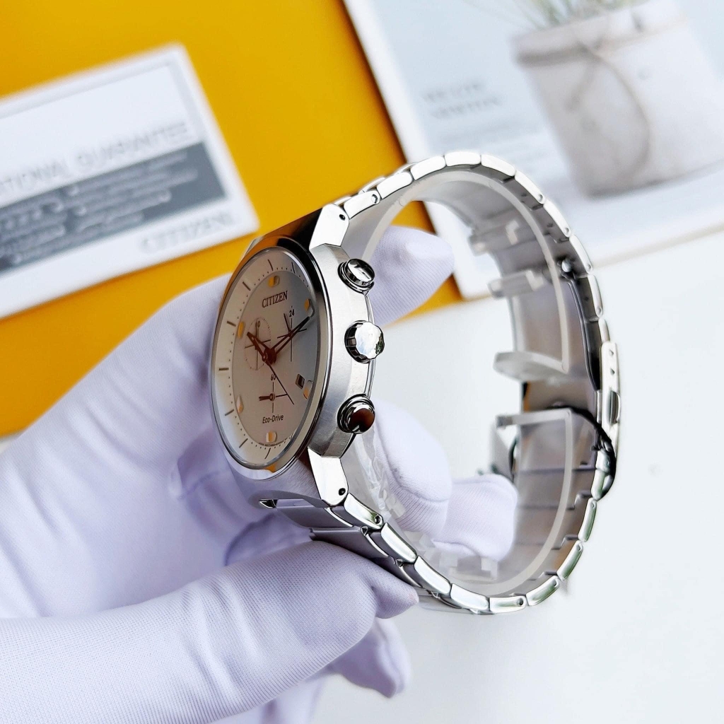 Logo Citizen và ký hiệu bộ máy Eco-Drive được đặt tại vị trí 12h và 6h quen thuộc. Ba mặt số phụ được trang bị tại vị trí 3h, 6h, 9h phục vụ cho chức năng chronograph đặc trưng của một chiếc đồng hồ thể thao. Đây là chức năng chính dùng để bấm giờ và hoạt động tách biệt với việc xem giờ trên đồng hồ. Ô lịch ngày được tích hợp tại vị trí 4h tạo nên tổng thể vô cùng thuận mắt người đeo.