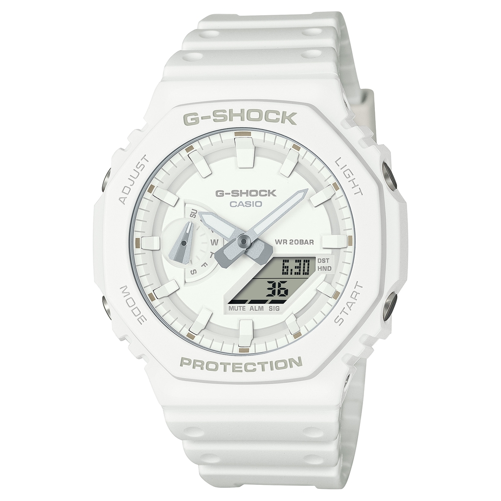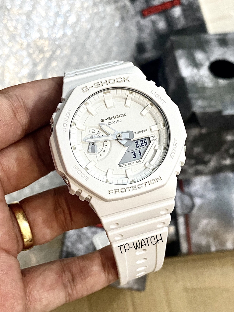 GA-2100 khoác lên mình hình dáng mang tính biểu tượng với phong cách đồng điệu, có sẵn ba màu phổ biến — ngọc lam, trắng và vàng dạ quang. Vỏ, gờ, dây đeo và thậm chí cả các thành phần mặt số riêng lẻ đều được hoàn thiện bằng các sắc thái khác nhau tinh tế của cùng một màu, mang lại vẻ ngoài đơn sắc với chiều sâu và kích thước đáng ngạc nhiên.